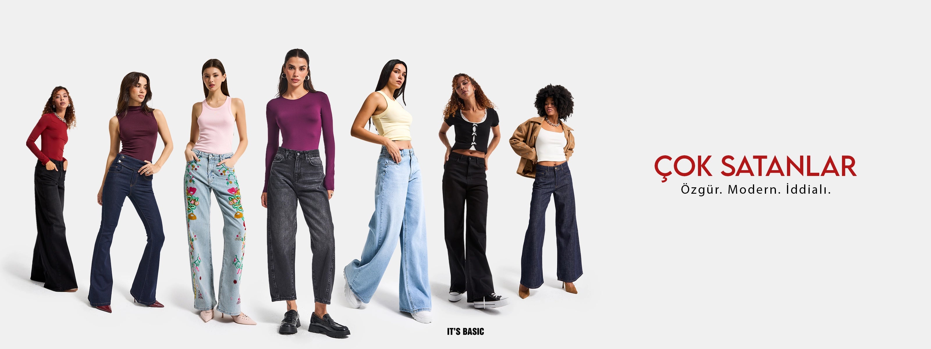 Sezonun favori jean kesimleri baggy, flare, palazzo ve straight It’s Basic yorumuyla bir arada. Günlük stile güçlü bir dokunuş katmak için jean koleksiyonunu keşfet.