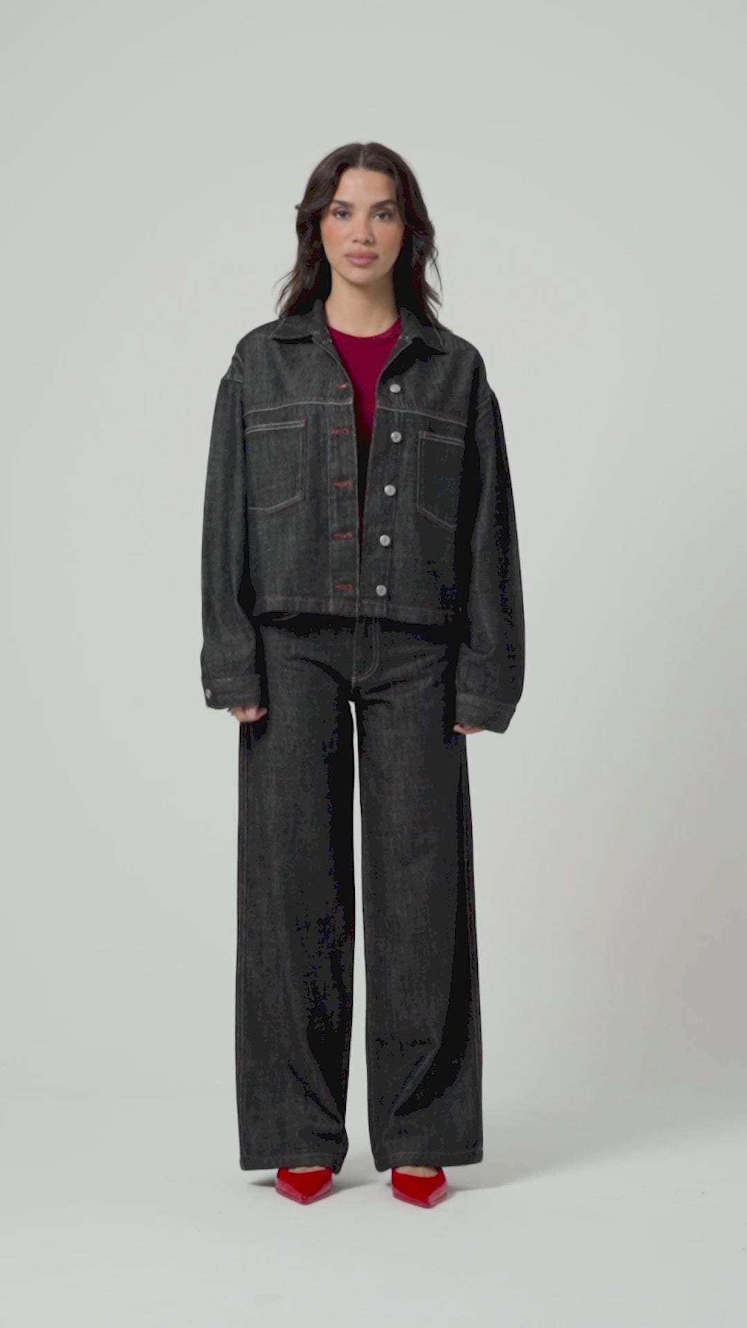 Kadın Tint Kırmızı Renk Çift Parça Kumaş Oversize Özel Tasarım Denim CeketKadın Tint Kırmızı Renk Çift Parça Kumaş Oversize Özel Tasarım Denim Ceket