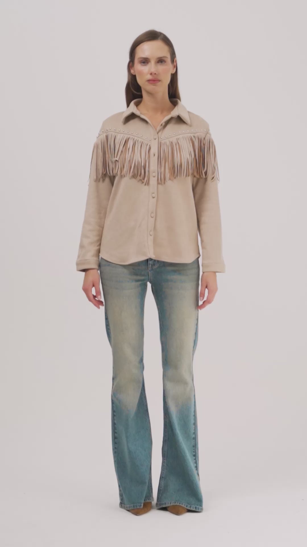 Kadın Taş Renk Süet Kumaş Püskül ve Drop Detaylı Tasarım Gömlek Ceket