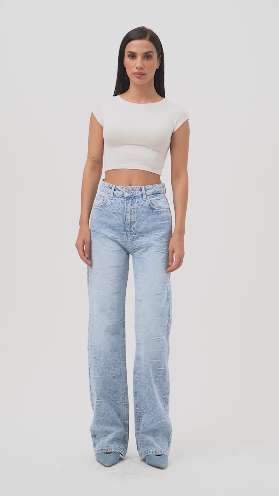 Kadın Pudra 6s6-20 Wide Leg Pleat Fit Nakış Desenli Özel Tasarım Denim Jean