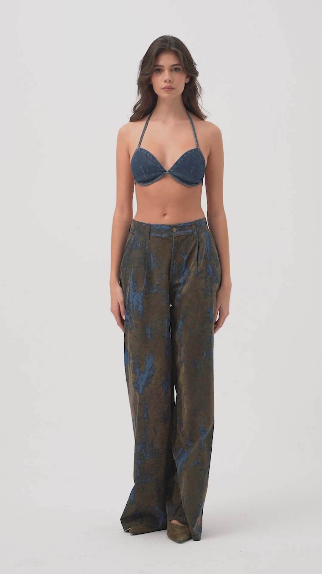 Kadın Kahve Mavi 1s6-15 Palazzo Fit Bol Kesim Özel Flok Kumaş Tasarım Denim Jean