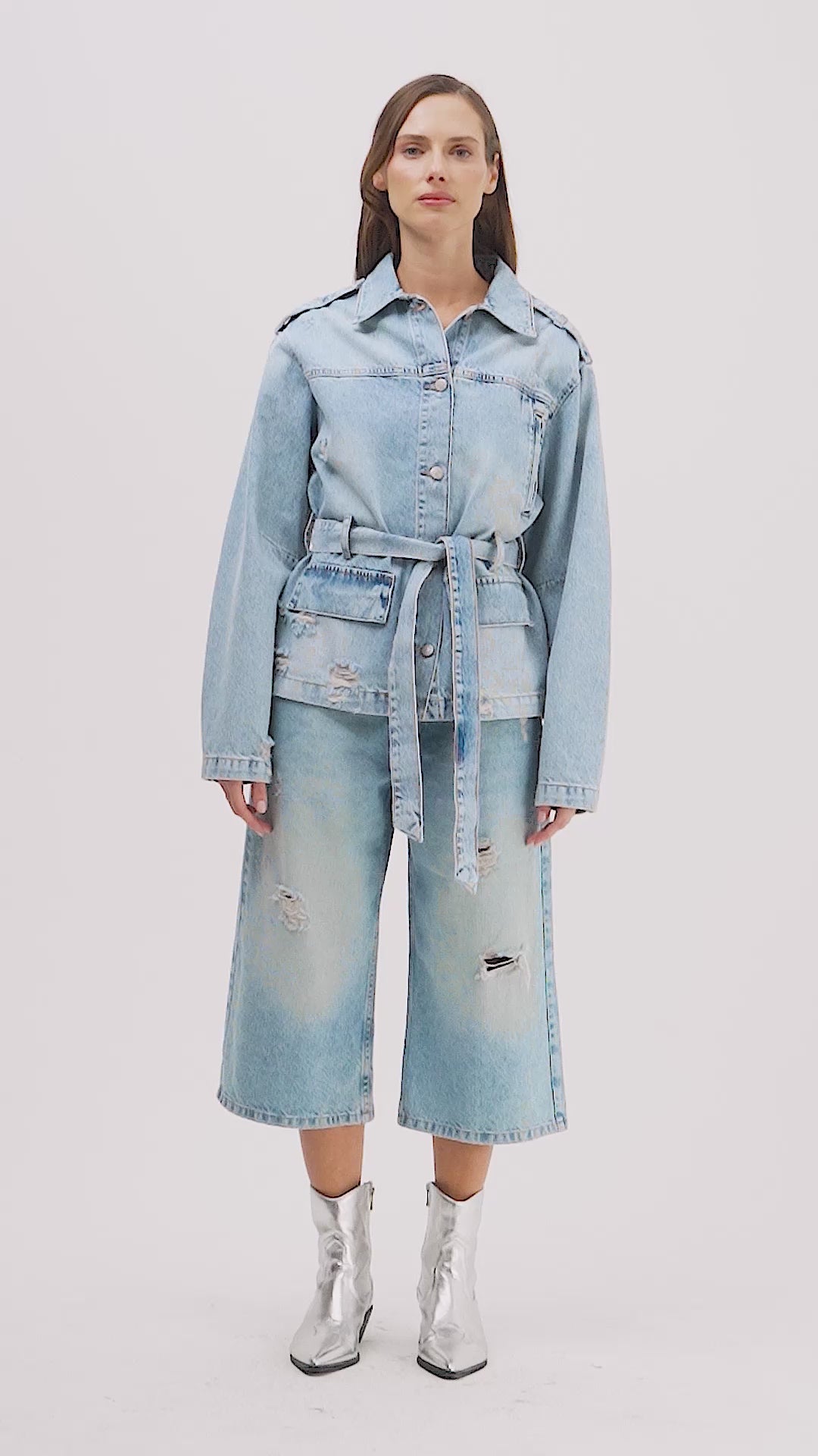 Kadın Ice 12s6-32 Oversize Kemer Detaylı Yırtık %100 Koton Denim Ceket