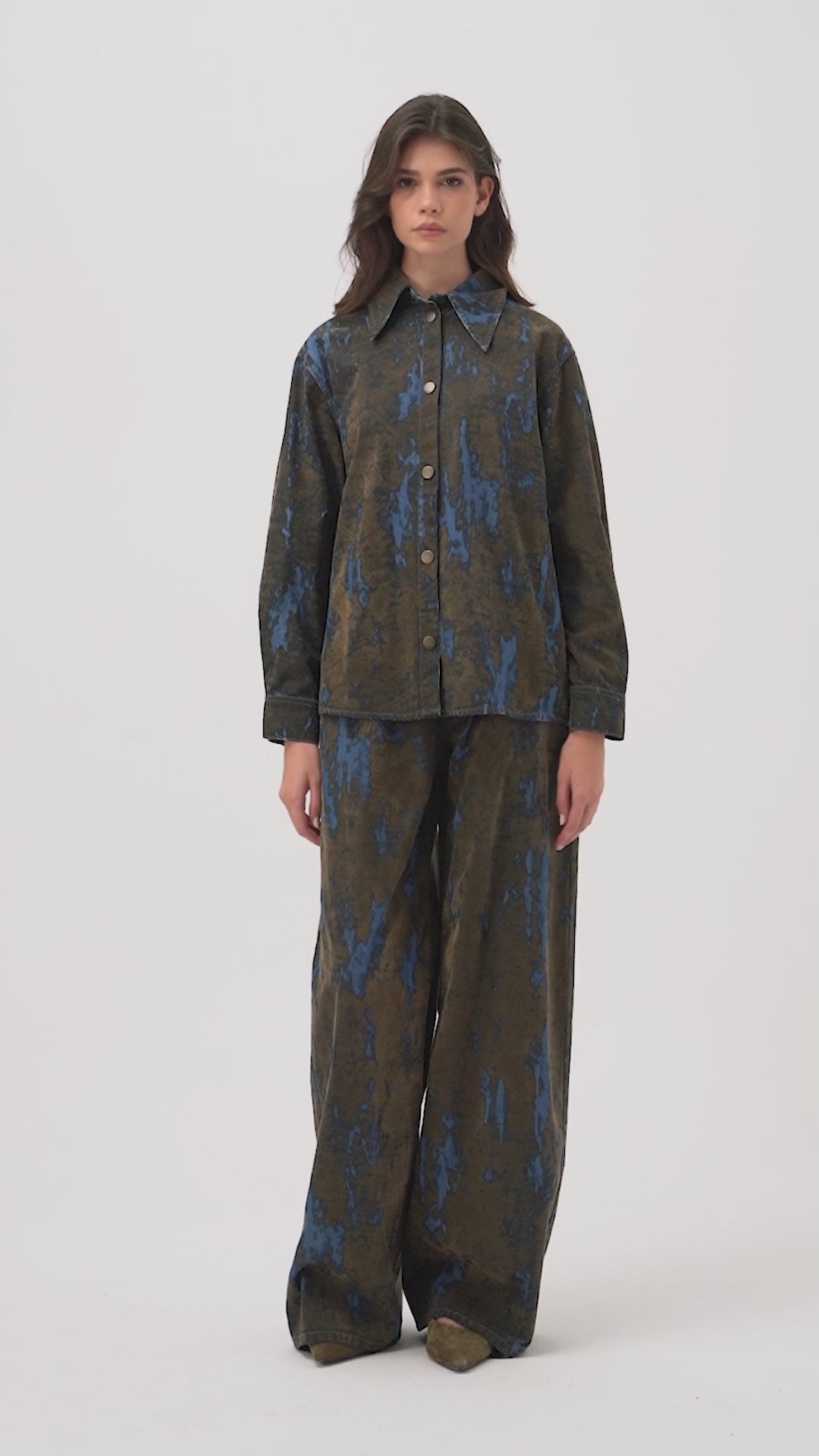 Kadın Kahve Mavi 1s6-15 Oversize Özel Flok Kumaş Tasarım Denim Gömlek