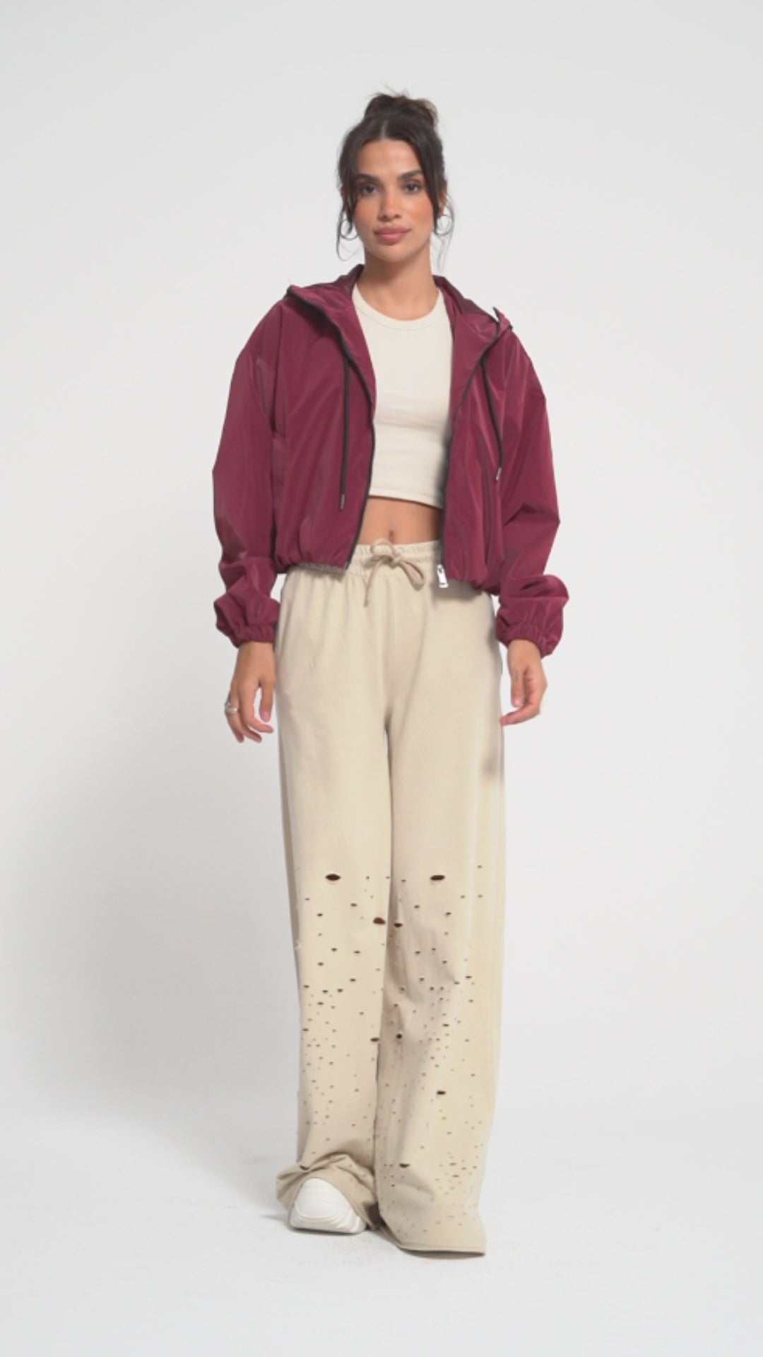 Kadın Bordo Renk w5-35 Önü Fermuarlı Bol Kesim Kapişonlu Yağmurluk Mont