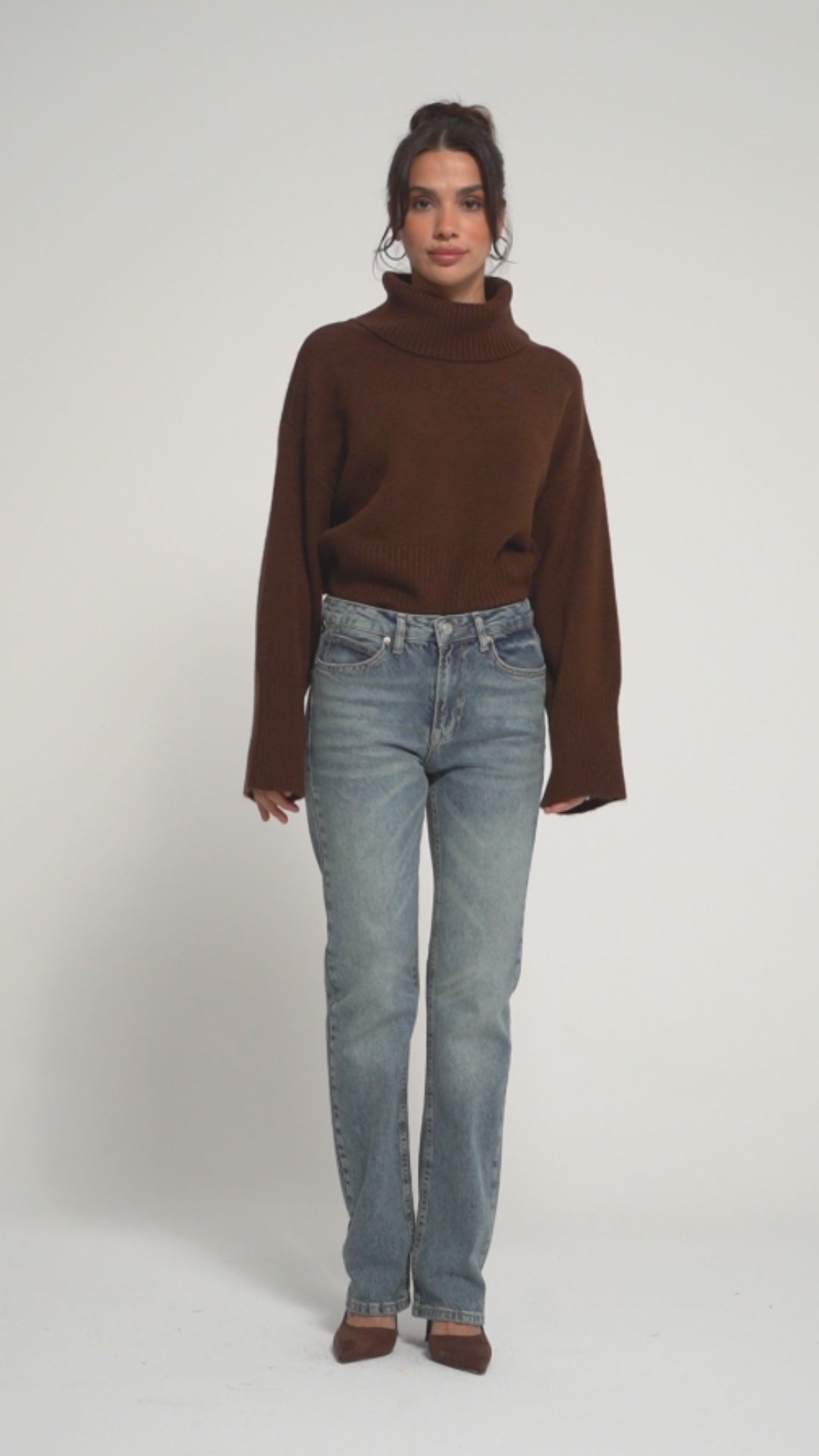 Kadın Kahverengi w5-16 Balıkçı Yaka Bol Kesim Örme Triko Kazak