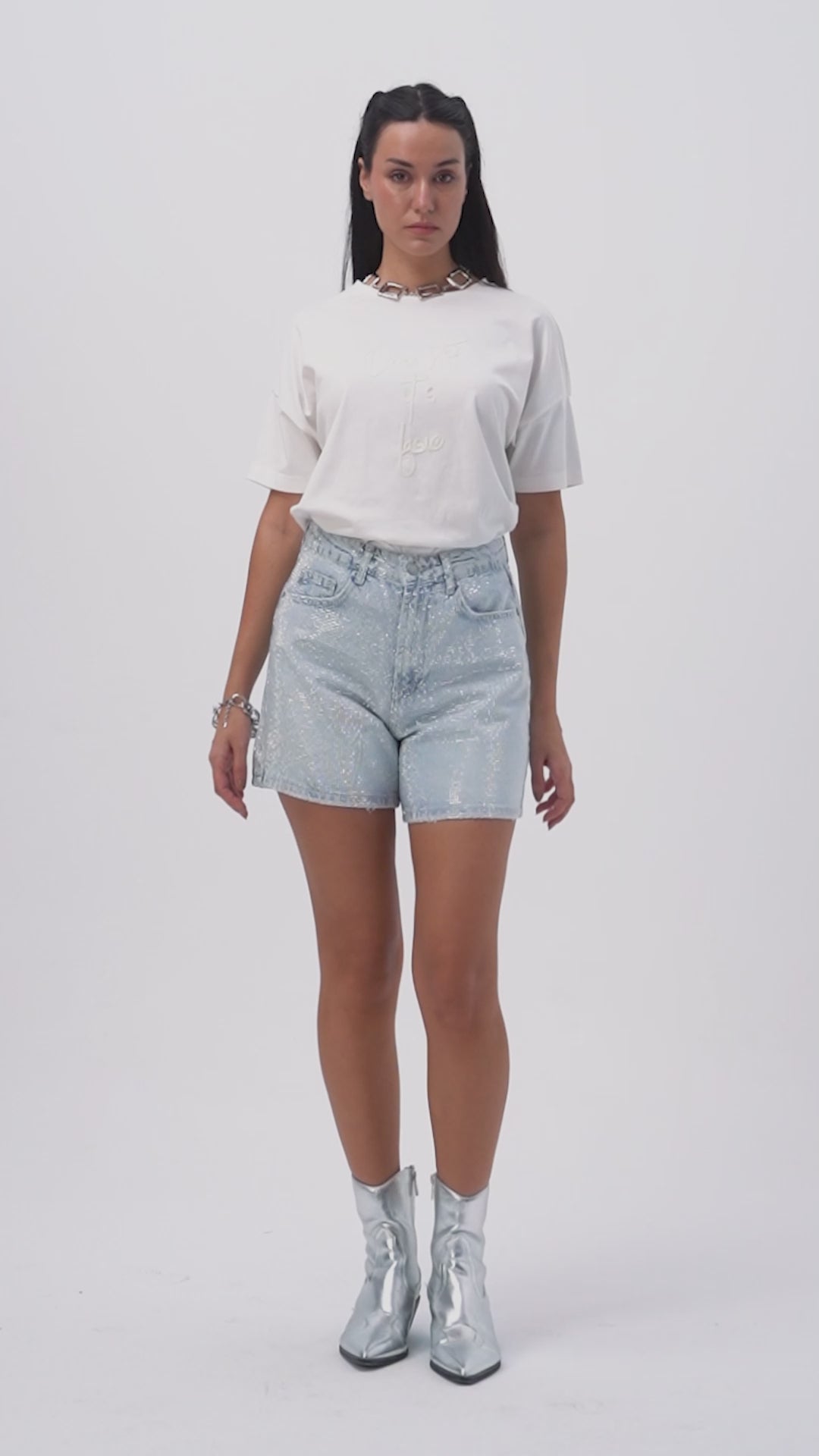 Kadın Ice T1-4s6-3 Mom Fit Parlak Taşlı Yıldız Baskılı Özel Tasarım Denim Şort