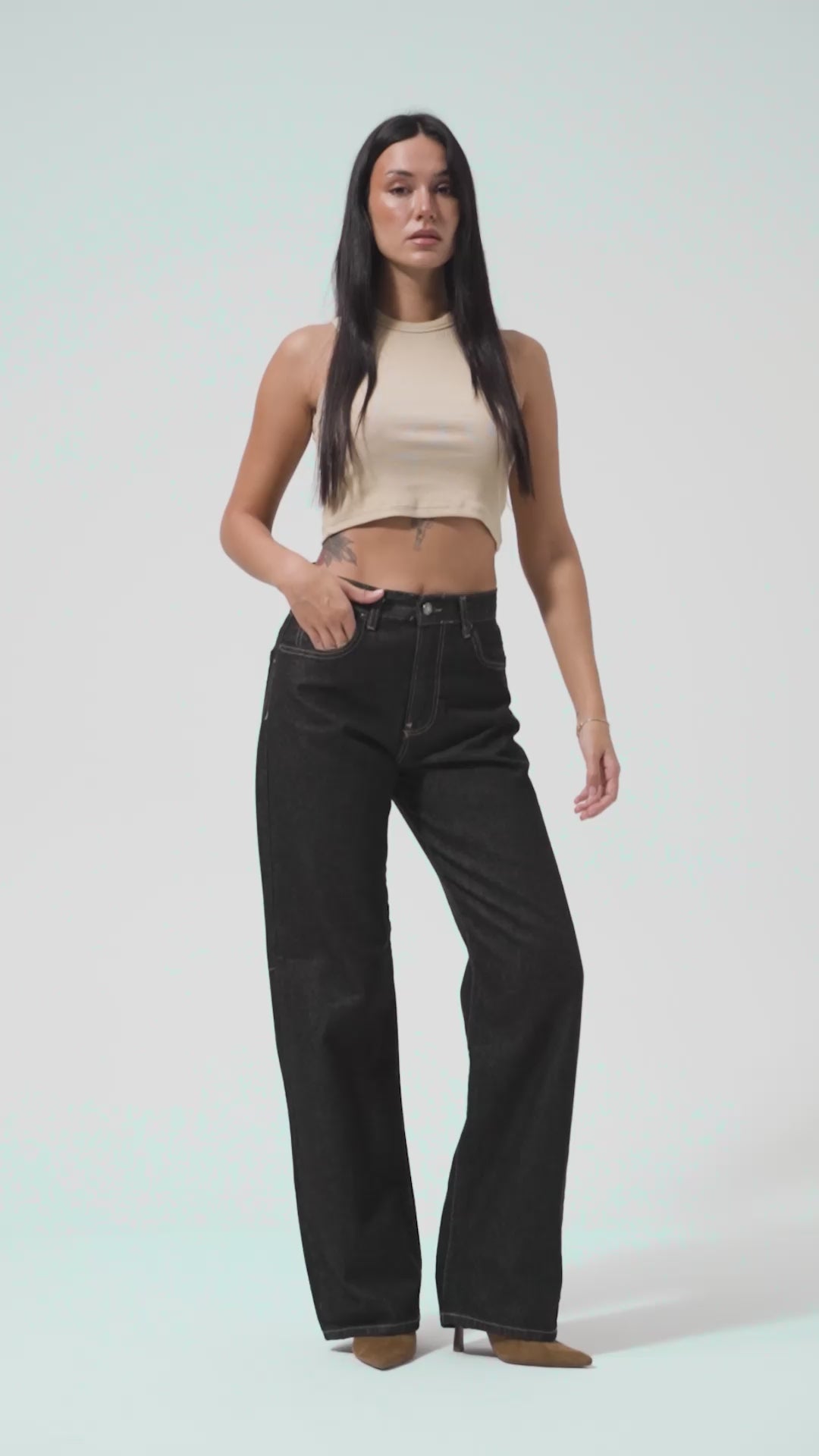 Kadın Siyah Renk 1s5-1 Loose Fit Orta Bel Viskon Kumaş %100 Koton Denim JeanKadın Siyah Renk 1s5-1 Loose Fit Orta Bel Viskon Kumaş %100 Koton Denim Jean
