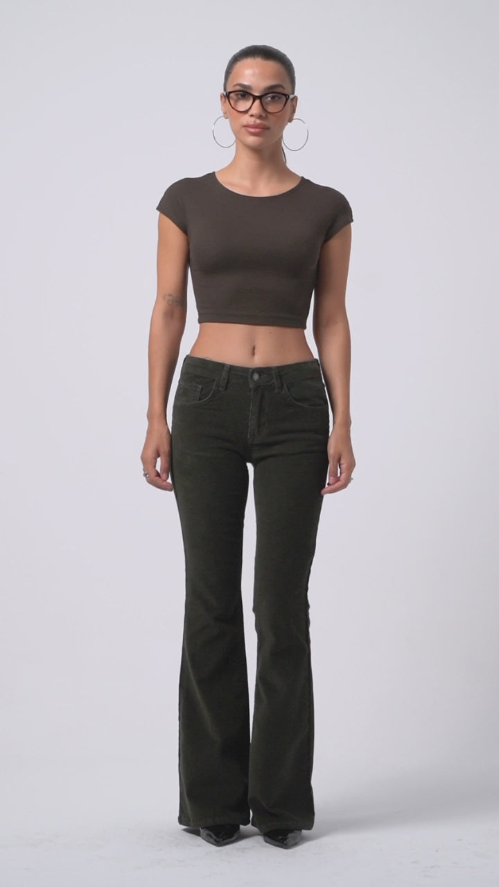 TükendiKadın Haki Renk 26w5-15 Low Waist Flare Fit İnce Fitilli Velvet Kadife Kumaş Pantolon