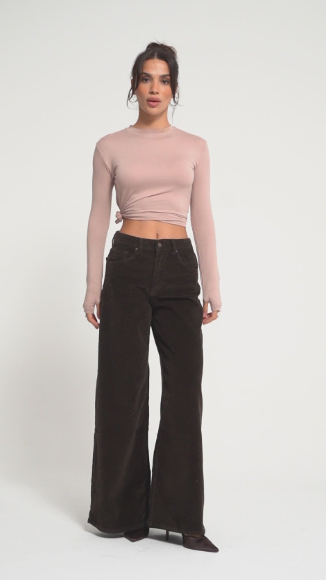 TükendiKadın Kahverengi 26w5-136 Palazzo Fit Esnek İnce Fitilli Velvet Kadife Kumaş Pantolon