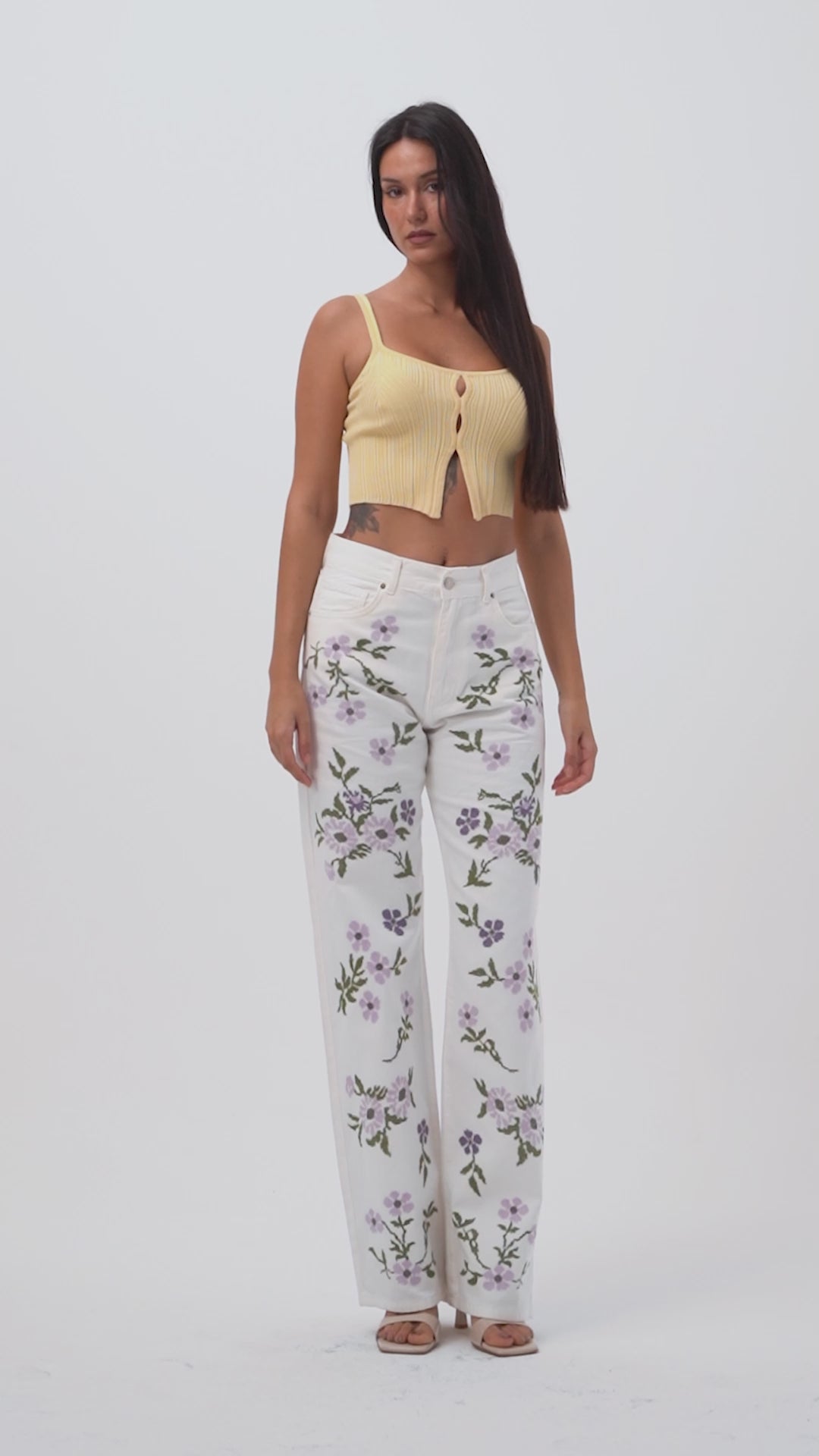 Kadın Kırık Beyaz 7s6-101 Loose Fit Çiçek Desen Nakışlı Özel Tasarım Denim Jean