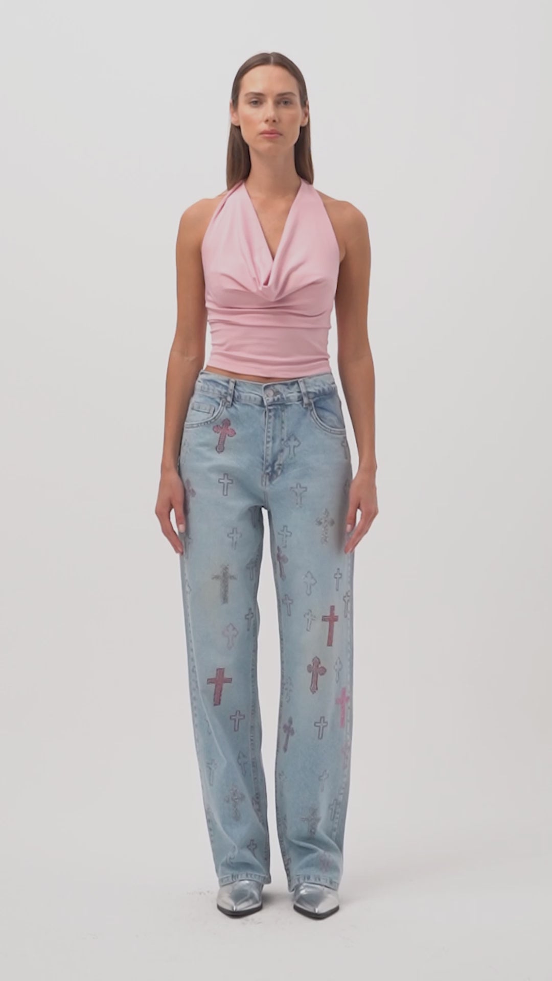 Kadın Pembe Renk S5-98 Halter Yaka İnce Fitilli Kumaş Parlak Taşlı Tasarım Body