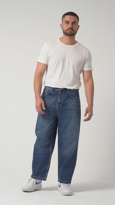 Erkek Koyu Mavi Renk 3w5-5 Loose Baggy Fit Bol Kesim Cep Nakış Detaylı Denim Jean