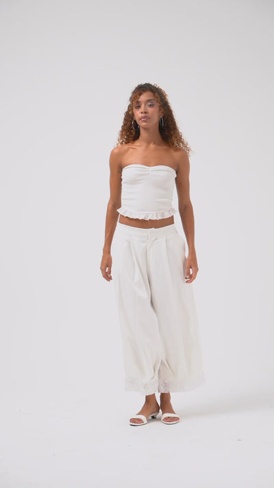 Kadın Ekru Renk Beyaz Dantel Detaylı Bol Kesim Özel Tasarım Kumaş Pantolon