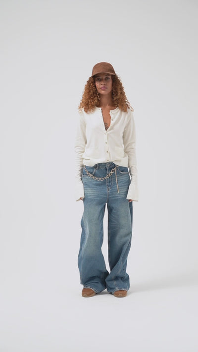 Kadın Kemik Renk w5-101 Volanlı Kol Önü Cepli Düğmeli Viskon Karışımlı Triko Hırka