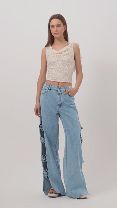 Kadın Kot Rengi Palazzo Fit Gül Detaylı Özel Tasarım Denim Jean