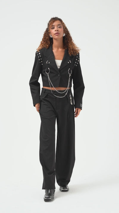 Kadın Siyah Renk Kuş Gözü Detaylı Crop Fit Özel Tasarım Kumaş Ceket