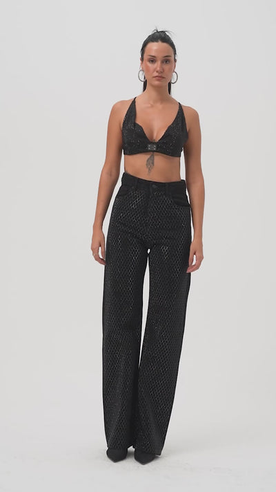 Kadın Siyah Renk T3-1s5-1 Straight Fit Yüksek Bel Işıltılı Parlak Taşlı Tasarım Denim Jean