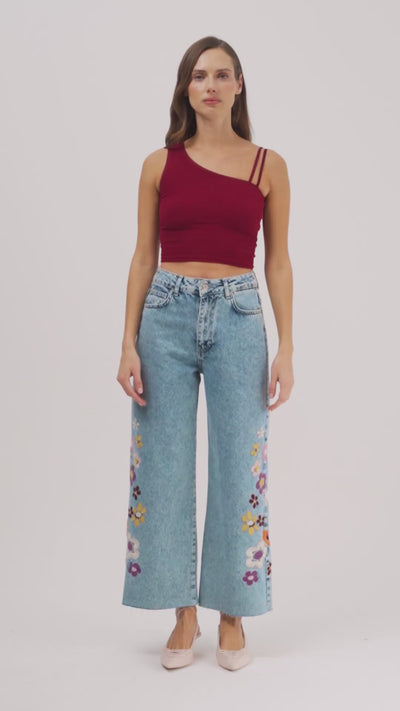 Women Snow Jeans Color Floral Embroidered Culotte Fit Design Denim