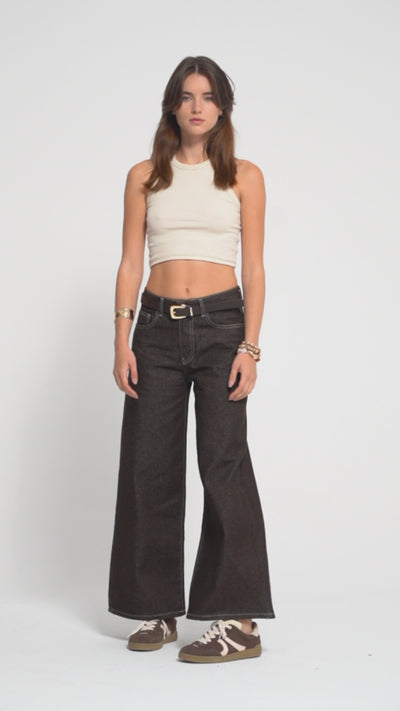 Kadın Acı Kahve Renk 7w5-16 Culotte Wide Leg Fit Kemerli Denim Jean