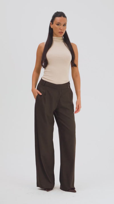 Kadın Acı Kahve s6-16 Neptun Kemer Detaylı Palazzo Fit Pileli Pantolon