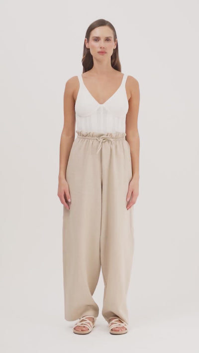 Kadın Bej Renk s6-57 Rahat Kesim Keten Kumaş Belden Lastikli Pantolon