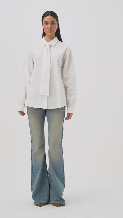 Kadın Beyaz Oversize Kravat Detaylı Özel Tasarım Bol Kesim Gömlek