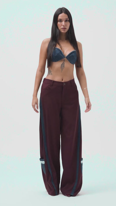 Kadın Bordo Palazzo Fit Denim Detaylı Özel Tasarım Pantolon