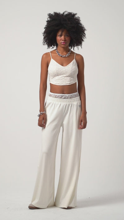 Kadın Ekru Renk Örme Kumaş Kemeri Dantelli Özel Tasarım Eşofman Pantolon