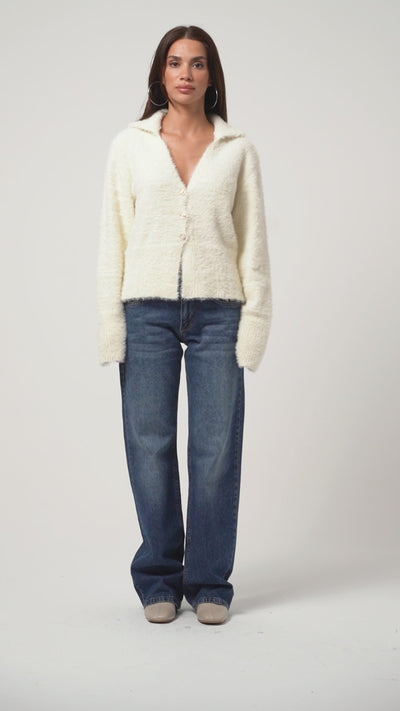 Kadın Ekru Renk w5-2 Önü Düğmeli Özel Dokuma Oversize Hırka