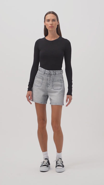 Kadın Gri Kot 4s6-12 Mom Fit Önden Cepli Denim Şort