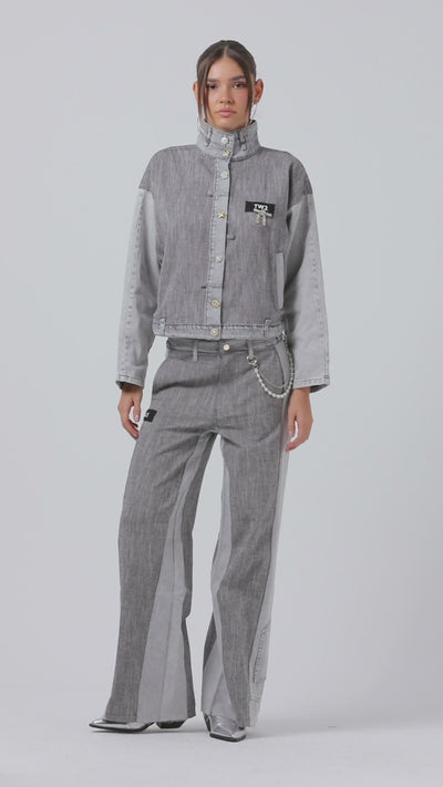 Kadın Gri Renk Kumaş ve Denim Parçalı Aksesuar Detaylı Özel Tasarım Pantolon