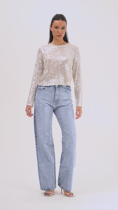 Kadın Gümüş Renk Pul Payet Detaylı Düz Kesim Bluz