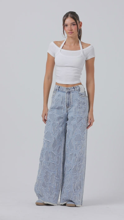 Kadın Ice Kot Rengi Yıpratma Detaylı Kumaş Özel Tasarım Palazzo Fit %100 Koton Denim Jean