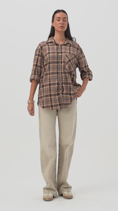 Kadın Kahve Ekose s6-10 Oversize Bol Kesim Pamuk Gömlek