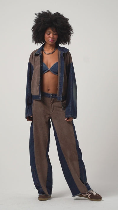 Kadın Kahve Kot Rengi Süet Denim Parçalı Bol Kesim Özel Tasarım Denim Pantolon