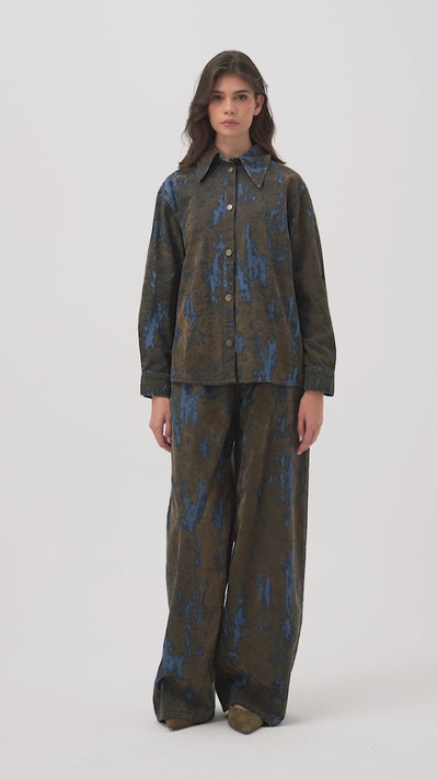 Kadın Kahve Mavi 1s6-15 Oversize Özel Flok Kumaş Tasarım Denim Gömlek