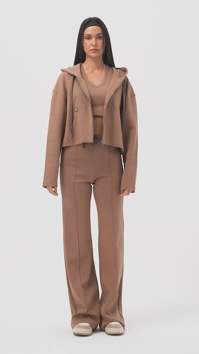 Kadın Kahve s6-16 Örme Kumaş Flare Eşofman Büstiyer ve Fermuarlı Sweatshirt 3'lü Kombin Takım
