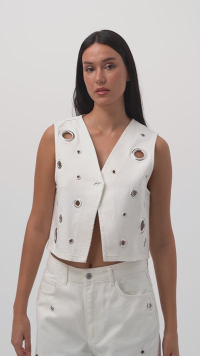 Kadın Kırık Beyaz 7s6-101 Crop Kuş Gözü Detaylı Özel Tasarım Denim Yelek
