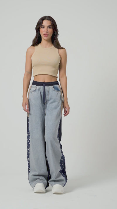 Kadın Kot Rengi Kumaş Denim Parçalı Bol Kesim Tasarım Denim Pantolon