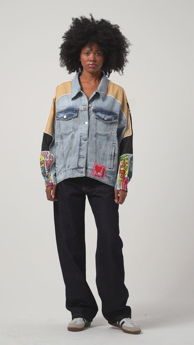 Kadın Kot Rengi Oversize Renkli Baskılı Özel Tasarım Denim Ceket