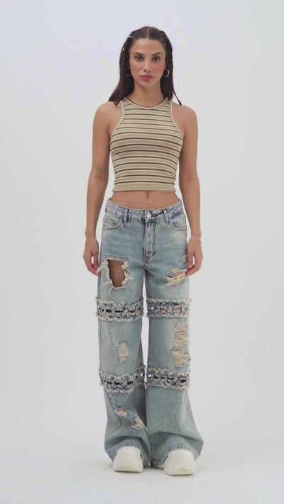 Kadın Kot Rengi Palazzo Fit Yırtık Detaylı Tasarım Denim Jean