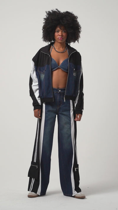 Kadın Kot Rengi Parçalı Kumaş Bol Kesim Özel Tasarım Denim Jean