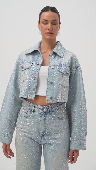 Kadın Kot Rengi T-4s6-32 Crop Fit Taş Detaylı Özel Tasarım Denim Ceket