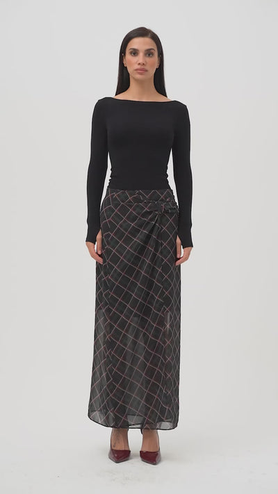 Kadın Koyu Ekose s6-1 Maxi Boy Kemer Detaylı Saten Etek