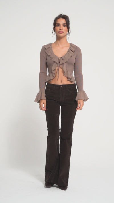 Kadın Koyu Kahverengi 26w5-136 Low Waist Flare Fit İnce Fitilli Velvet Kadife Kumaş Pantolon