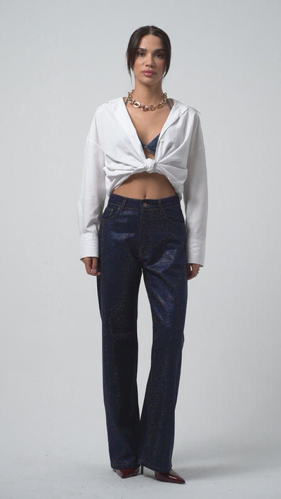 Kadın Koyu Mavi Renk T-7w5-50 Straight Fit Yüksek Bel Viskon Koton Kumaş Parlak Taşlı Tasarım Denim Jean
