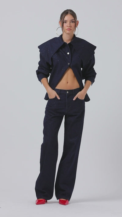 Kadın Laci İndigo Renk 7w5-50 Loose Fit Parlak Taş Detaylı İç Boy 80cm Özel Tasarım Denim Jean