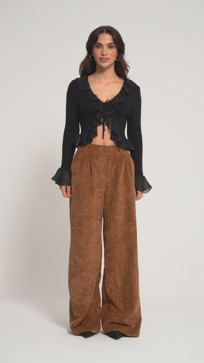Kadın Latte Kahve w5-76 Süper Palazzo Fit Pileli Kalın Fitilli Velvet Kadife Kumaş Pantolon
