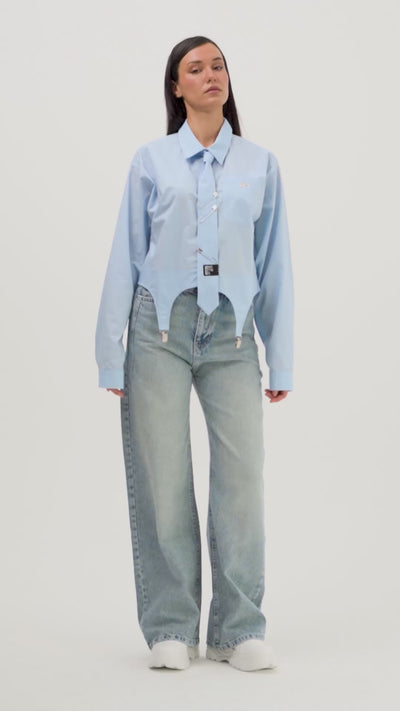 Kadın Mavi Renk Kravatlı Tasarım Bol Kesim Gömlek