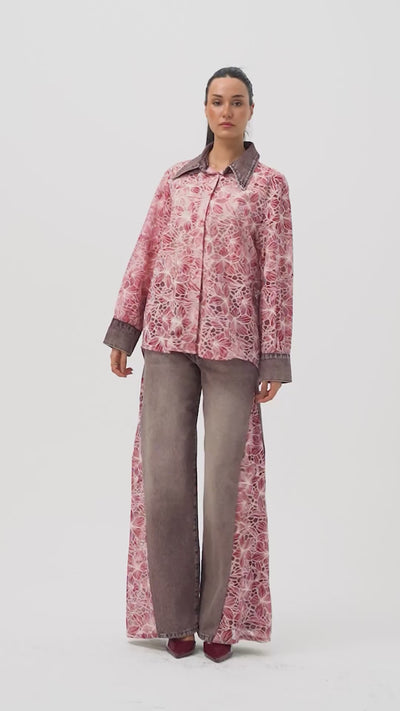 Kadın Pembe 4s6-157 Oversize Özel Tasarım Dantel Ve Gül Detaylı Denim Yakalı Gömlek Ceket